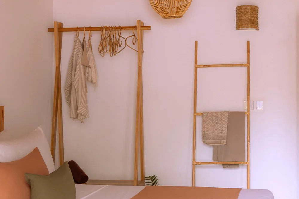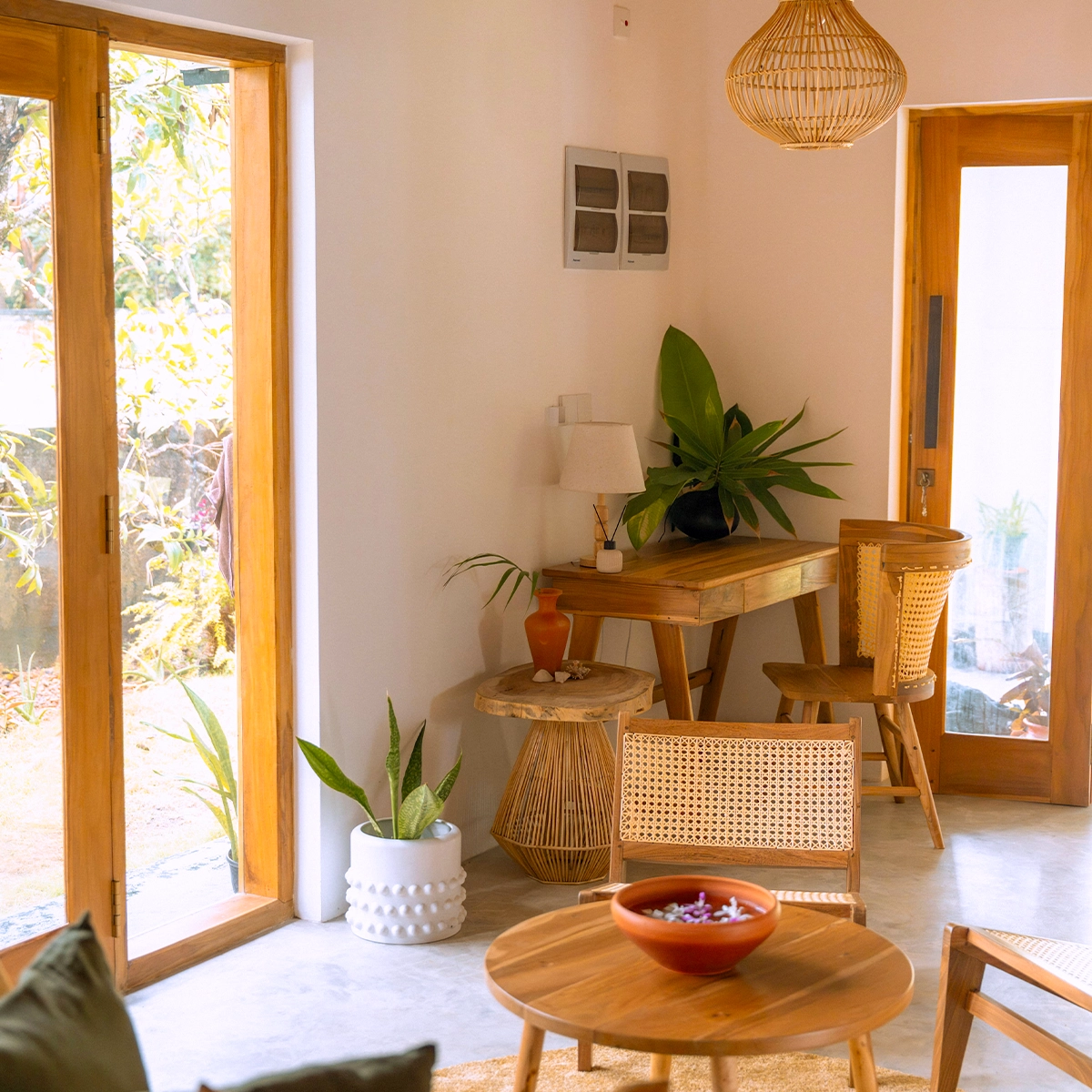 - Handcrafted wooden furniture and rattan lighting